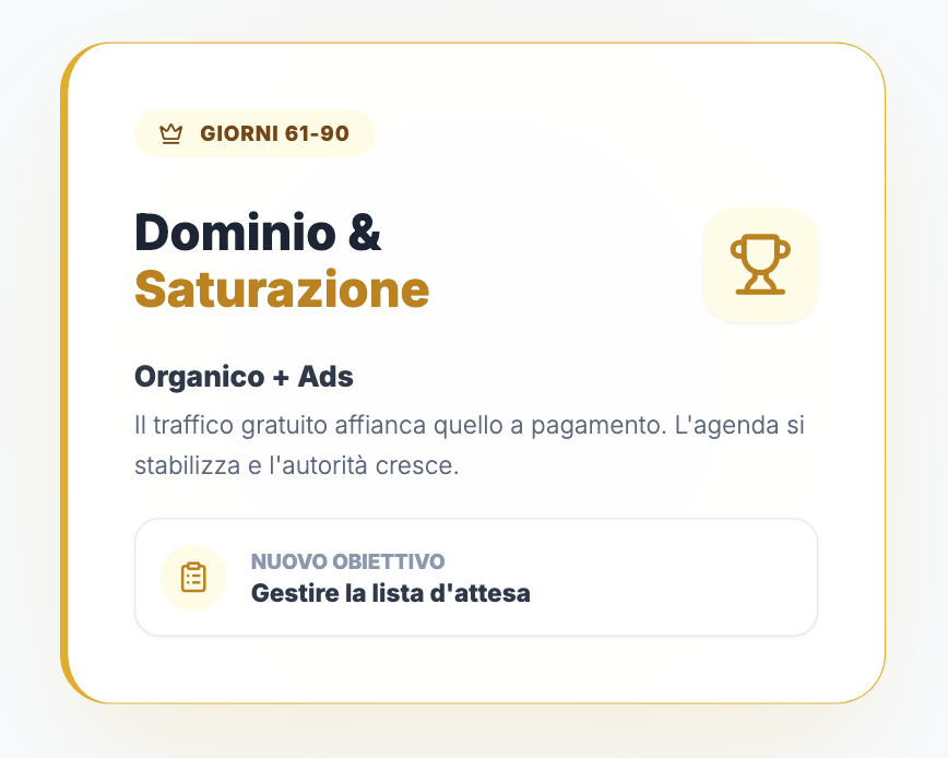 L’agenda si stabilizza. L’obiettivo non è più “cercare clienti”, ma gestire la lista d’attesa.